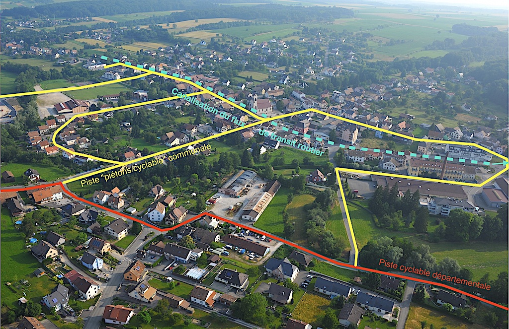 Autre principe de base du projet ” Le village où il fait bon vivre” : l’ensemble des lieux publics de la Commune seraient accessibles par piste “Piétons/ Cyclable” sécurisées.